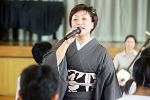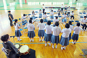 7月14日(水)生目南中学校体育館で「ふるさと先生こんにちは」の三味線体験授業が開催されました。
