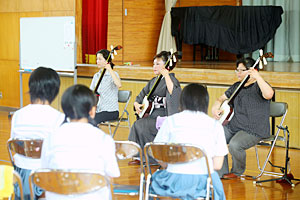 | 三味線体験授業スタート | 湿度の高い中、真剣に聞いています。 | |