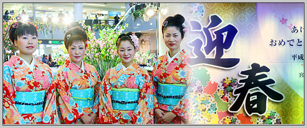 | お正月の空港内は帰省客で賑わっています。 | 衣装も新春らしく華やかに♪ | |