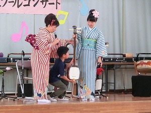 また三味線にチャレンジのコーナーでは、各学年1名が代表で選ばれ「ソーラン節」を演奏。