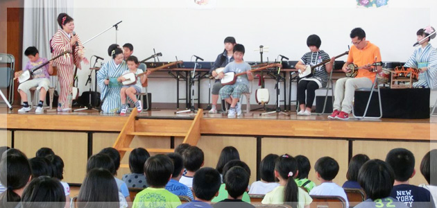 私たちは今日の演奏を楽しみにしていました。 初めて聞く津軽三味線の音色は力強くとてもかっこよかったです。三味線の音色はとても心に残りました。 生で聞くソーラン節をきいて楽しい気持ちになりました。 これからもこのすばらしい曲を伝えていってください。今日はほんとうにありがとうございました。