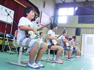 校長先生をはじめ先生方も子ども達と一緒に三味線と三線にチャレンジしていただきました。