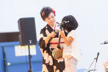 津軽三味線や日本各地の民謡メドレーを聴いていただいた後は、メドレーで使われた楽器の紹介。