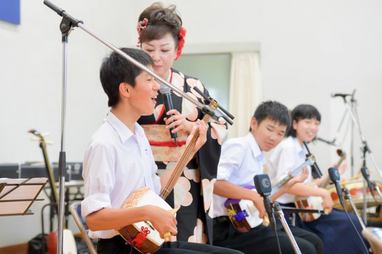 学校と地域を結ぶコンサート in 西都初めて触る三味線にドキドキ。