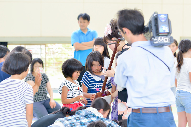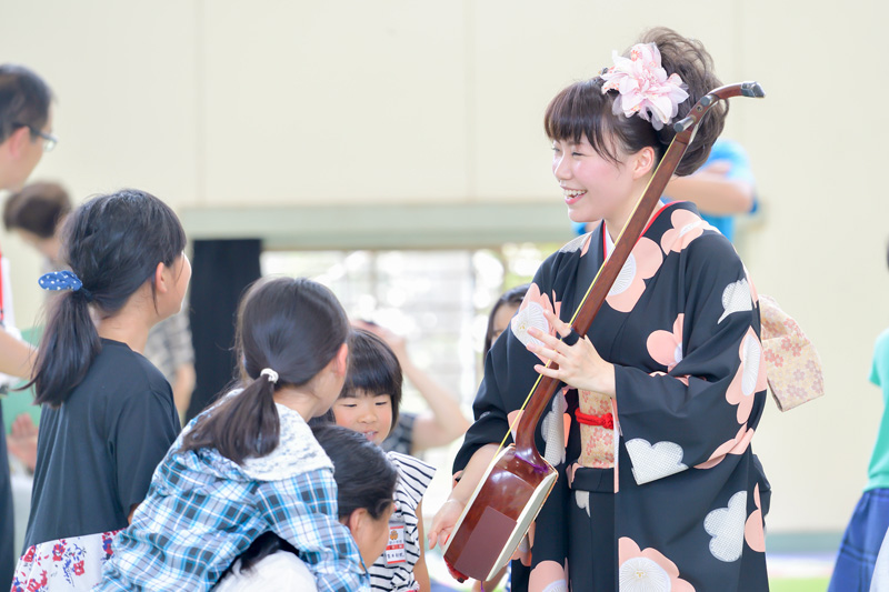 休憩時間には児童生徒の皆さんに三味線に触れていただきました。