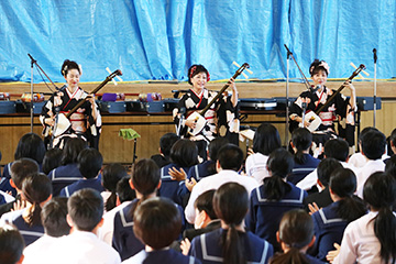 初めて三味線を演奏するということで、ステージに上がったときは緊張していた生徒の皆さんもだんだんと余裕のある表情に変化していきました。