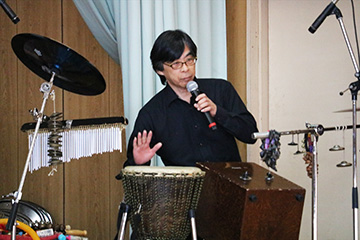 パーカッションは曲の盛り上げ役と話す服部さんは、たくさんの楽器の中から「ジャンベ」にスポットを当てて紹介。アフリカの楽器であるジャンベをたたき、サプライズで服部さんがアフリカ風に歌い、子どもたちも手拍子を打って楽しんでいました。