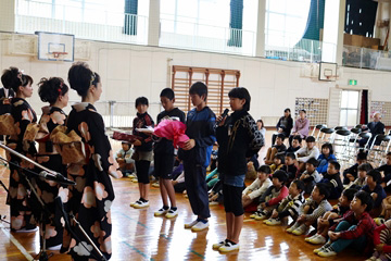メドレー最後は青森県の「津軽あいや節」。家元の力強い三味線に華映の太鼓、由宇月の唄が加わり、児童の皆さんはバチの動きに注目しながらじっと聞き入ってくれました。
